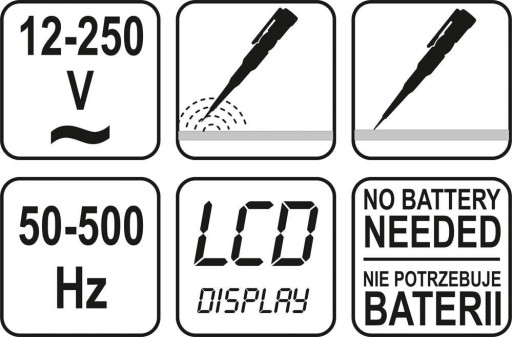 - wykrywanie napięcia AC metodą kontaktową: 12 - 250V
