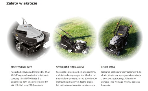 Kosiarka spalinowa DELTAFOX DG-PLM 4019 P (produkcja Grizzly GmbH) imponuje mocnym 4-suwowym silnikiem RATO RV125-S i pojemnością skokową 127,1 cm³. Solidna, ale lekka obudowa z tworzywa sztucznego sprawia, że kosiarka waży zaledwie 16 kilogramów. Dzięki promieniowi cięcia 400 mm można skosić jednocześnie dużą powierzchnię, a dzięki 40-litrowemu koszowi zbierającemu, trawa jest starannie zbierana, eliminując potrzebę czasochłonnego grabienia po koszeniu. Ponadto ergonomicznie wygięty uchwyt można złożyć, aby przechowywać kosiarkę w wyjątkowo oszczędzający miejsce sposób.