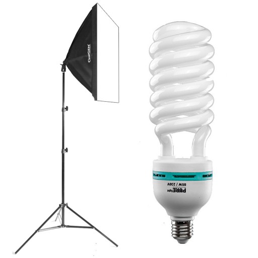 Zastosowana oprawa, to wysokiej jakości softbox przeznaczony zarówno do żarówek błyskowych, jak i żarówek światła ciągłego. Czasza o wymiarach 40x40 cm wykończona jest wewnątrz srebrnym materiałem. Światło jest równomiernie rozprowadzane już we wnętrzu softboxu i zachowuje identyczną moc na całej powierzchni dyfuzora. Na zewnątrz softbox jest matowo czarny, dzięki czemu nie odbija światła innych lamp.