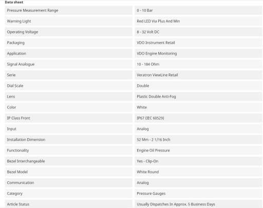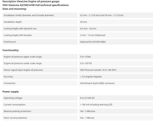 Manometr ViewLine wykrywa wahania ciśnienia oleju silnikowego. Posiada zabezpieczenie przed odwrotną polaryzacją oraz podwójną soczewką zapobiegającą zaparowaniu, która zapewni maksymalną precyzję.