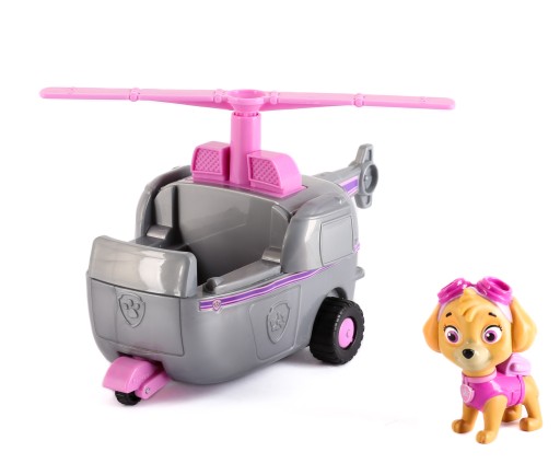 W skład zestawu wchodzi helikopter oraz figurka przedstawiająca pieska Skye. Figurka jest wierną kopią filmowego bohatera, ubrana jest w różowy kubraczek i plecak, na głowie ma różową pilotkę z goglami. Figurka posiada ruchomą głowę. Helikopter jest w kolorze metalicznym szarym z różowo-fioletowymi elementami. Posiada trzy ruchome kółka, dzięki którym bez problemu może poruszać się po powierzchniach płaskich, oraz obrotowe śmigło. Figurkę Skye można umieścić w kokpicie helikoptera, dzięki czemu staje się jego pilotem.