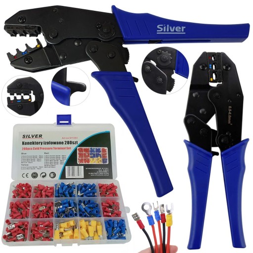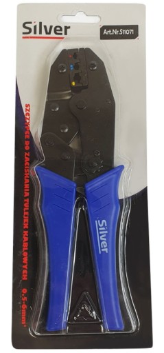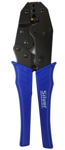 Profesjonalne szczypce z mechanizmem zapadkowym przeznaczone do zaciskania izolowanych końcówek konektorowych na przewodach. Wykonane z blachy stalowej, utwardzanej do ok 44-47HRC. Obsługują konektory izolowane w zakresie od 0,5 do 6,0mm².