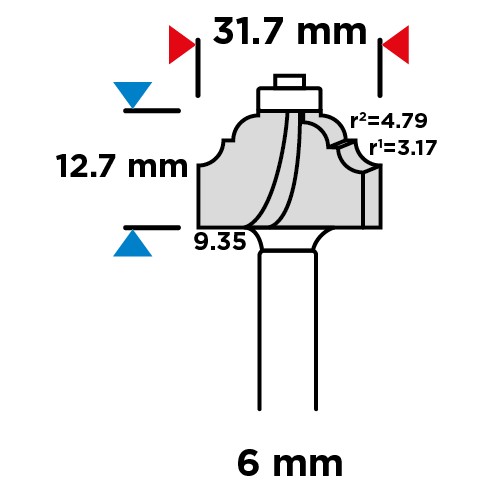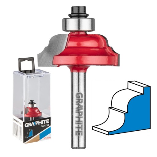 Frez kształtowy z łożyskiem, ozdobny, HM, 31.7 x 12.7 mm, trzpień 6 mm GRAPHITE (nr ref. 56H230) przeznaczony do precyzyjnej obróbki m.in. drewna, PCV, płyt wiórowych przy pomocy frezarek górnowrzecionowych. Głowica wyposażona została w płytki skrawające wykonane z węglika spiekanego. Frez wyposażony został w łożysko, które ułatwia prowadzenie frezarki.
