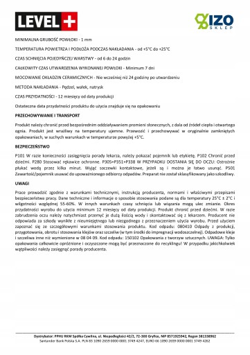Prace prowadzić zgodnie z warunkami technicznymi, instrukcją producenta, normami i właściwymi przepisami bezpieczeństwa pracy. Dane techniczne i informacje o sposobie stosowania podane są dla temperatury 25°C ± 2°C i wilgotności względnej 55-60%. W innych warunkach czasy schnięcia lub wiązania mogą ulec zmianie. Okres przydatności wyrobu do użycia minimum 12 miesięcy od daty produkcji. Produkt chronić przed dziećmi. W razie zabrudzenia oczu należy natychmiast przemyć je dużą ilością wody i skontaktować się z lekarzem. Producent nie odpowiada za szkody wynikłe z nieumiejętnego lub niezgodnego z przeznaczeniem użycia wyrobu. Przed użyciem zapoznać się ze szczegółowymi warunkami stosowania produktu. Kod odpadu: 080410 Odpady z produkcji, przygotowania, obrotu i stosowania klejów oraz szczeliw (w tym środki do impregnacji wodoszczelnej). Odpadowe kleje i szczeliwa inne niż wymienione w 08 04 09. Kod odpadu: 150102 Opakowania z tworzyw sztucznych. UWAGA: Tylko opakowania całkowicie opróżnione i oczyszczone mogą być przeznaczone do recyklingu! W przypadku jakichkolwiek wątpliwości należy zasięgnąć porady producenta.