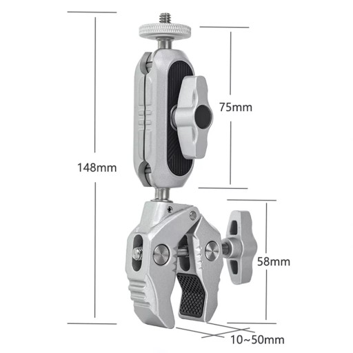 ✔️ Zacisk daje nam bardzo dużo możliwości montażowych w studio i na zewnątrz. Motylkowy docisk jest regulowany i bardzo mocny dzięki czemu dopasujemy go do przedmiotów o różnej grubości np. blat biurka, płot, gałąź, rurka, kierownica, deskorolka itd. Głowica idealnie nadaje się do mocowania monitorów poglądowych LCD przy aparatach, kamerach, gimbalach, statywach i innych urządzeniach w standardowym gwincie mocującym 1/4''. Głowica posiada również płynną regulację położenia w zakresie 360 stopni zarówno w poziomie jak i pionie.