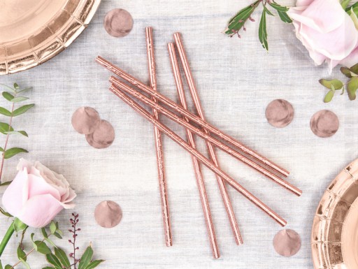 Słomki papierowe, złotoróżowe (Gold Rose), proste, opakowanie 10 sztuk. Długość 19,5 cm, średnica ok. 6 mm.