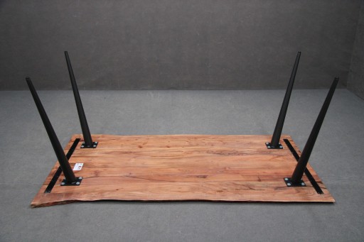 Wykonany w całości z drewna z metalowymi nogami w stylu industrialnym. Specyficzny wygląd zawdzięcza ręcznej produkcji, posiada nierówności na krawędziach, które są wykonywane lub pozostawione celowo, a skośne nogi nadają mu lekkości. Dzięki temu jest indywidualny i niepowtarzalny. Specyficzne nogi oraz struktura blatu sprawiają, że stół doda wnętrzu oryginalnego stylu i wyjątkowego uroku.