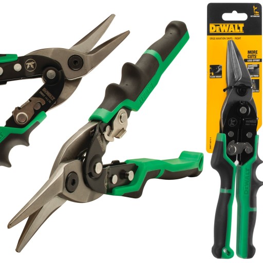 Nożyce DEWALT Ergo Aviation zostały zaprojektowane ze zmniejszoną rozpiętością rękojeści, zapewniając mniejszy poziom siły mięśniowej wymaganej podczas cięcia twardych materiałów. To narzędzie jest tradycyjnie używane do cięcia aluminium, sidingów winylowych, ekranów, tektury, skóry, miedzi i blachy o grubości od 18 do 22 Gauge. Ząbkowana krawędź tnąca noża zapobiega ślizganiu się materiałów podczas użytkowania, a antypoślizgowy, dwumateriałowy uchwyt amortyzujący zapewnia pewny i wygodny chwyt.
