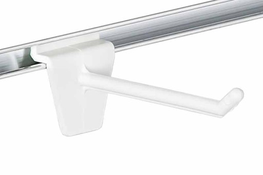 Haczyk Slatwall, pasuje do paneli sklepowych Spacewall. Długość 10cm lub 15cm. Materiał użyty do wykonania to białe tworzywo sztuczne.