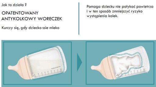 Innowacyjne butelki Zero Zero posiadają wewnętrzną, silikonową torebkę. Ta opatentowana torebka silikonowa, w czasie karmienia jest rozciągnięta w zależności od tego, jak dziecko ssie, podobnie jak to dzieje się w gruczołach mlecznych u kobiety karmiącej. Ten innowacyjny system powoduje brak pęcherzyków powietrznych w pokarmie, zatem dziecko nie połyka powietrza, które mogłoby spowodować kolkę. System ten zapobiega także utlenianiu się mleka i utracie ważnych składników odżywczych.
