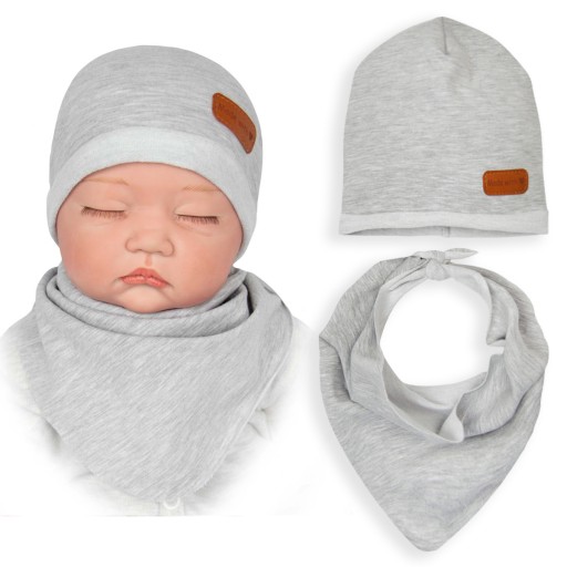 Komplet jest w całości wykonany z elastycznej dresówki, dzięki której świetnie się układa. Wybraliśmy dzianinę bardzo wysokiej jakości - gęstą i miłą w dotyku. Dzięki jej sprężystości czapeczka delikatnie przylega do główki dziecka a chustka łatwo się wiąże na karku.