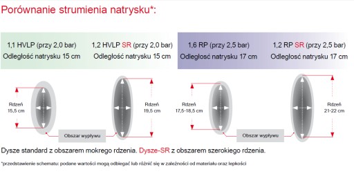 - 9 różnych dysz - oprócz standardowych dysz od 0,3 do 1,1 dostępne są również zestawy dysz specjalnych SR o rozmiarach 0,8, 1,0, 1,2 i 1,4, w których strumień rozpylanej cieczy jest dostosowany specjalnie do małych prac naprawczych ("Spot Repair", "Smart Repair")