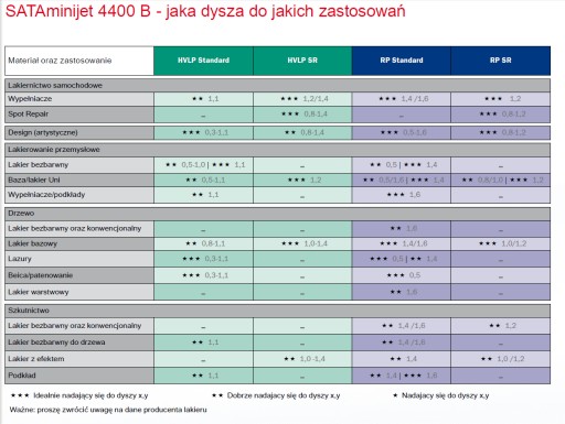 Do prac precyzyjnych - idealność w szczegółach, SATAminijet 4400 B w najróżniejszych pracach lakierniczych gwarantuje precyzję oraz dokładność wykonania. Bogaty wybór dysz pozwala na bardzo szerokie zastosowanie. Specjalne dysze SR idealnie spełniają wymogii w aplikacji zaprawek (Spot-Rapair). Możliwość stosowania wszystkich dostępnych lakierów o tradycyjnych lepkościach, jak również na bazie wody.