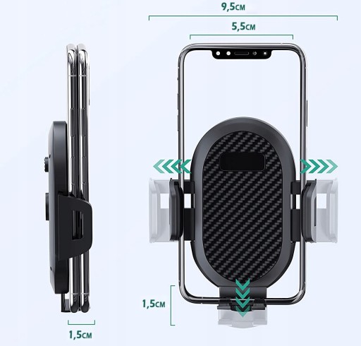 Niezwykle prosta obsługa, wystarczą tylko dwa kroki: naciśnij przycisk z tyłu uchwytu, ramiona otworzą się automatycznie. Następnie włóż telefon i zaciśnij ramiona uchwytu. Kompatybilny z większością telefonów komórkowych dostępnych na rynku o szerokości od 4 do 7 cali.