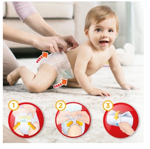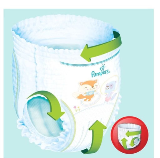 Gdy dziecko staje się aktywne i próbuje raczkować podczas zmieniania pieluszki, może być trudno ją założyć. Pieluchomajtki Pampers Pants poradzą sobie z tym bez problemu. Pieluchomajtki Pampers Pants łatwo się zakłada, a ponadto zapewniają do 12 godzin suchości. Są elastyczne i dostosowują się do ruchów dziecka, dzięki czemu zapewniają pełen komfort oraz dopasowanie. Rewolucyjne 3 kanaliki chłonne pomagają równomiernie rozprowadzić wilgoć, zapobiegając jej gromadzeniu się*, oraz zamykają ją wewnątrz pieluszki, dzięki czemu skóra dziecka pozostaje sucha. Pieluchomajtki Pampers Pants zmienia się bardzo szybko i łatwo, nawet jeśli dziecko raczkuje.