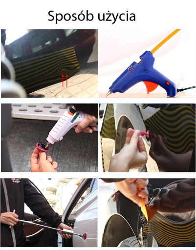 Dokładnie oczyść i odtłuść dotkniętą powierzchnię przed użyciem. Użyj kleju na gorąco (brak w zestawie), aby przykleić plastikowe części i pozwolić na wystarczające ogrzanie. Nałóż klej na gorąco na płaską część plastikowej części i dociśnij w miejscu, w którym chcesz naciągnąć. Pozwól klejowi stwardnieć, na końcówkę przymocuj wsteczny młot, następnie przesuń ciężarek na młotku górę. Powtarzaj ten proces, aż karoseria wyprostuje się.