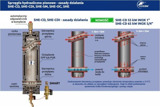 - zapotrzebowanie na ciepło ze strony instalacji grzewczej jest mniejsze niż ilość ciepła wytwarzana przez kocioł (zawory termostatyczne na grzejnikach są przymknięte). W tej sytuacji część czynnika grzewczego wraca przez sprzęgło bezpośrednio do kotła i daje sygnał automatyce kotłowej do zmniejszenia mocy kotła lub jego wyłączenia;