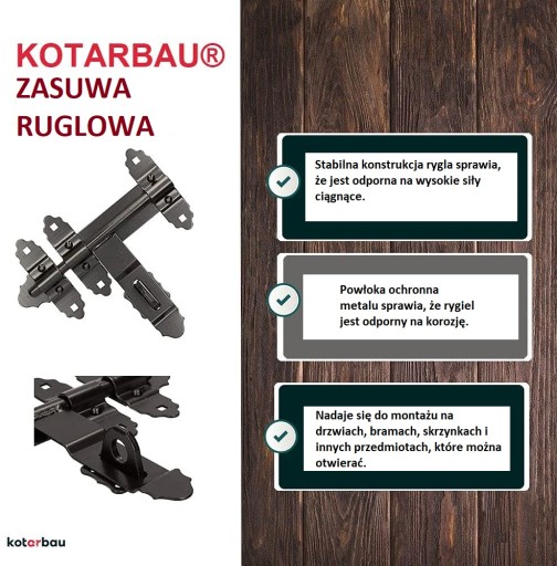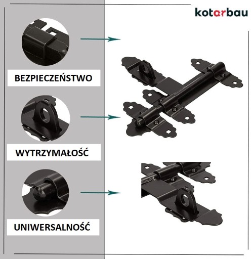 Produkt charakteryzuje się kutą stalową, solidną budową, przez co posłuży jako trwałe zabezpieczenie bramy. Element malowany proszkowo na kolor czarny, co nadaje mu uniwersalnego wyglądu, który z łatwością dopasujesz do modelu swoich drzwi.