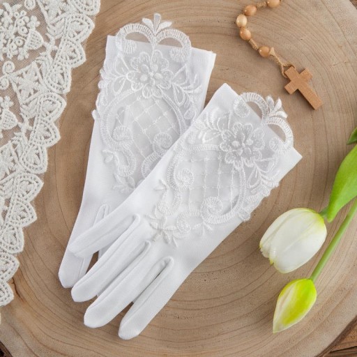 Przepiękne rękawiczki komunijne, które w wyjątkowy sposób ozdobią dłonie dziewczynki. Zdobione koronkowym wzorem prezentują się efektownie i oryginalnie. Niezbędny dodatek do stroju dziewczynki, która przystępuje do sakramentu I Komunii Świętej.
