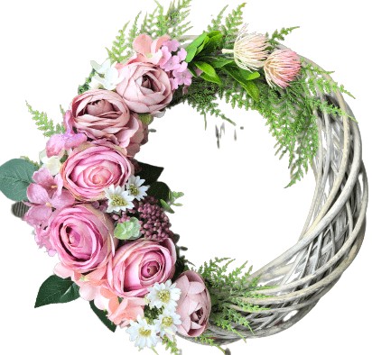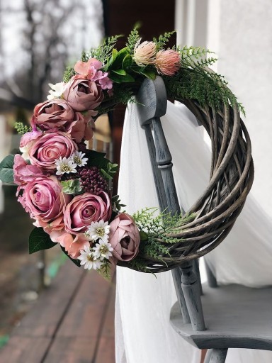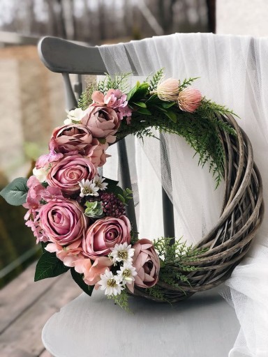 Wianek, ozdobiony sztucznymi kwiatami róż, pełników, hortensji oraz dodatkami i liśćmi.