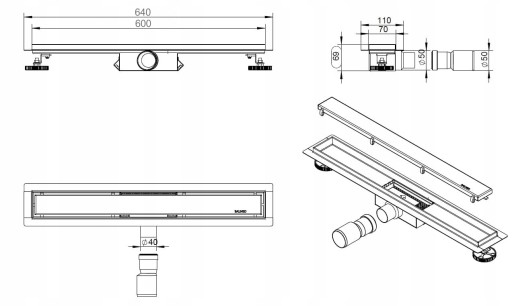 - Odpływ liniowy wyposażony jest w regulowane, stabilne nóżki ułatwiające wypoziomowanie