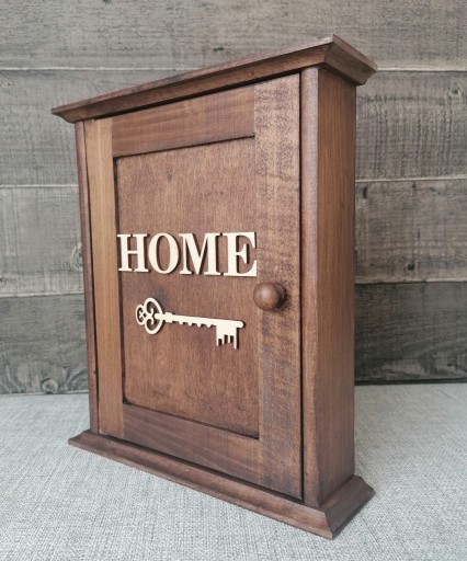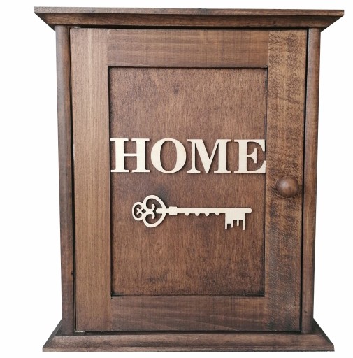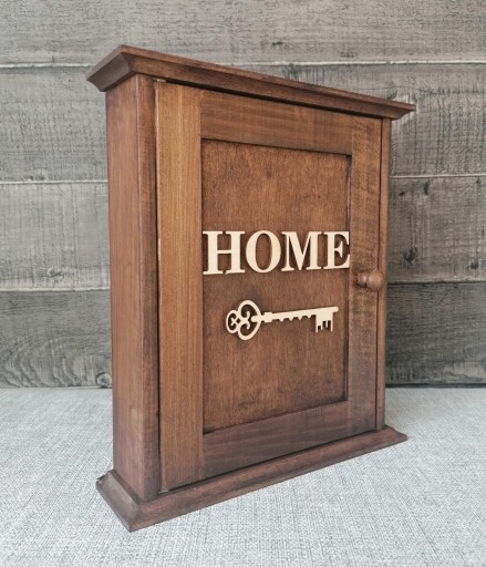 Na drzwiczkach szafki znajdują się drewniany napis HOME i stylizowany klucz.