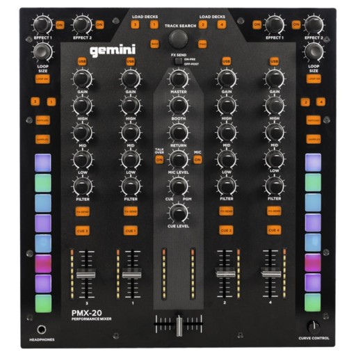 Gemini PMX-20 to wytrzymały 4-kanałowy mikser DJ i kontroler oprogramowania USB/MIDI ze zintegrowanym 24-bitowym interfejsem audio. Oprócz 16 wielofunkcyjnych klocków RGB (8 na kanał), mikser DJ oferuje obszerne wejścia i wyjścia, w tym zbalansowane i niezbalansowane wyjścia główne, jak również wymienny crossfader z regulowaną krzywą. Dodatkowo wszystkie elementy sterujące wysyłają sygnały MIDI, dzięki czemu można sterować parametrami oprogramowania DJ z miksera. Wyposażony w dedykowane elementy sterujące wyborem ścieżki, efektami, pętlami i przykładami, Gemini PMX-20 zapewnia wszystko dla profesjonalnych DJ-ów.