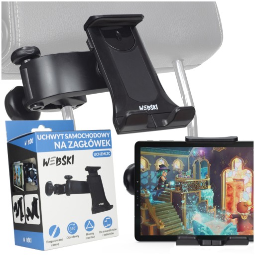 Oryginalny, regulowany uchwyt samochodowy montowany do zagłówka marki Webski.