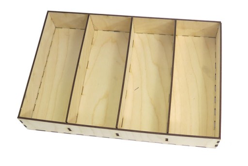 - Pudełko ze sklejki o grubości 3mm z 4 przegródkami o zewnętrznych wymiarach: 31.8x21.2x5.5cm