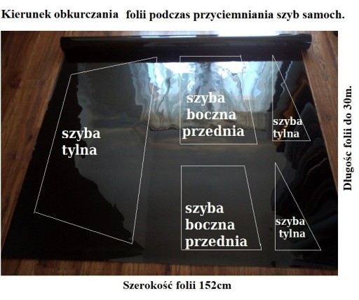 Folię należy układać w prawidłowym kierunku względem wyprofilowanych szyb samochodowych aby dopasowała się do kształtu szyby (kurczliwość na długości folii), poniżej strony zdjęcie jak to rozrysować.