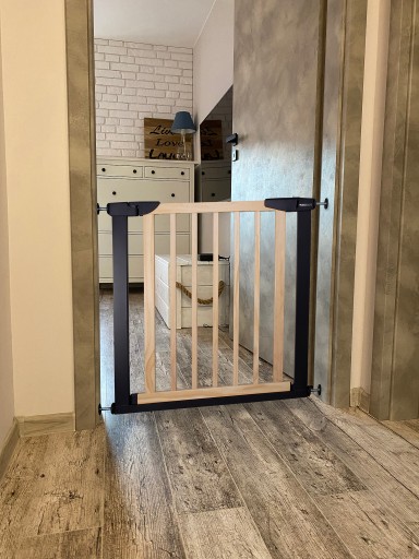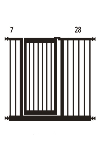 Bramkę zabezpieczającą, która ma standardowy wymiar montażu wynoszący 75-82 cm. Dodatkowo, dołączone są dwa rozszerzenia: pierwsze o szerokości 7 cm i drugie o szerokości 28 cm. Dzięki tym rozszerzeniom, bramka może być dostosowana do szerokości otworu o różnych rozmiarach.