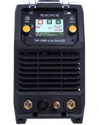 Urządzenie THF 238 PRO LCD marki MAGNUM jest profesjonalną, lekką spawarką inwertorową przeznaczoną do spawania metodą TIG HF (z bezstykowym zajarzaniem łuku spawalniczego) prądem przemiennym AC oraz stałym DC. THF 238 zapewnia doskonałą wydajność w spawaniu aluminium i jego stopów, stali niestopowej, niskostopowej, wysokostopowej, tytanu oraz innych spawalnych metali i stopów. Urządzeniem można również spawać metodą MMA z wykorzystaniem topliwych elektrod otulonych.