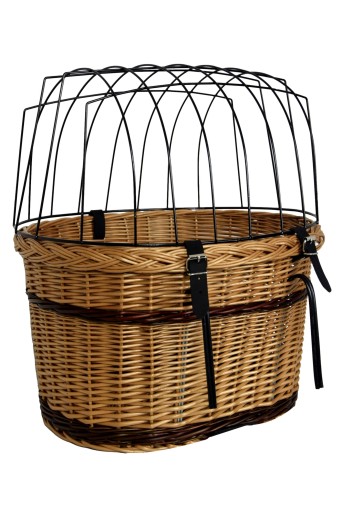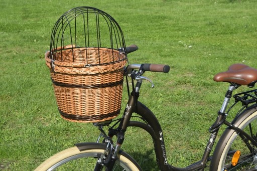 Koszyk z wikliny na rower z metalowym zamknięciem – Idealny koszyk do transportu psa, kota. Koszyk umieszcza się na kierownicy za pomocą specjalnie wygiętych haków pokrytych specjalnym tworzywem, aby nie zarysować kierownicy. Haki można ręcznie wyginać, aby dopasować do kierownicy. Kratka górna mocowana jest za pomocą trzech pasków, istnieje możliwość jej regulacji. Górną kratkę można całkowicie zdjąć, aby kosz mógł spełniać inną rolę np. kosza na zakupy.