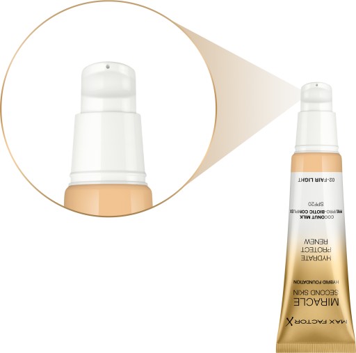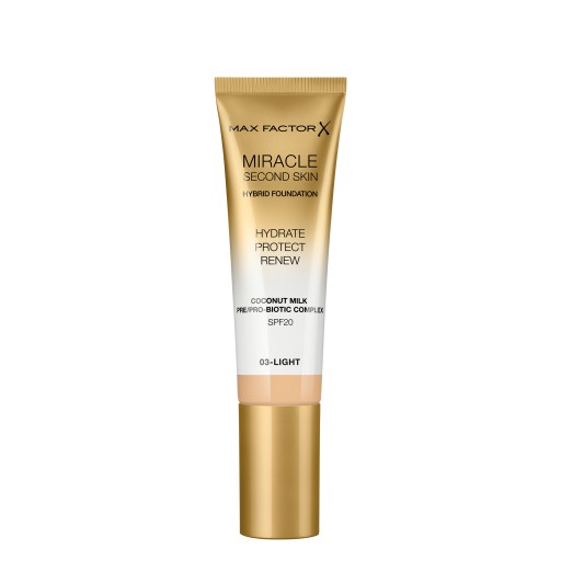 Max Factor Miracle Second Skin to wyjątkowe połączenie lekkości płynnego podkładu i właściwości kryjących typowych dla podkładów w kompakcie. Mleczko kokosowe pochodzenia naturalnego doskonale nawilża skórę, która pozostaje miękka i promienna przez cały dzień. Bogata i lekka konsystencja z łatwością wnika w pory, zapewniając niewidoczne, niewyczuwalne krycie oraz efekt drugiej skóry. Wzbogacony o probiotyki i prebiotyki podkład z filtrem UV wspiera naturalną warstwę ochronną skóry, a przebadana klinicznie formuła Miracle Second Skin wspomaga proces odnowy naskórka i zawiera filtr SPF 20 dla dodatkowej ochrony. Podkład do twarzy Max Factor jest odpowiedni dla wszystkich rodzajów skóry, nawet dla skóry wrażliwej.