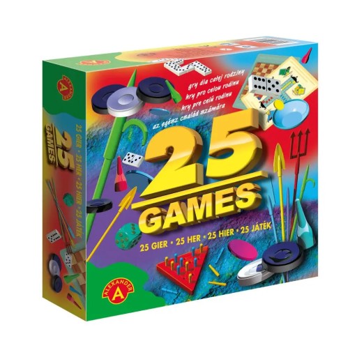 Można w nim znaleźć klasyczne gry planszowe: Warcaby i Młynek. W zestawie znajduje się również bardzo interesująca gra logiczna Trójkąt. Są tam także gry zręcznościowe: Bierki i Pchełki. 25 gier to zestaw, który sprawi wiele radości i zapewni sporo emocji każdemu, bez względu na wiek i upodobania.