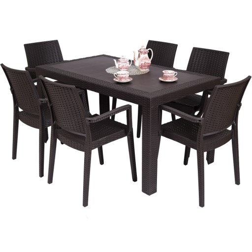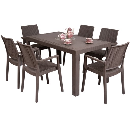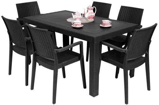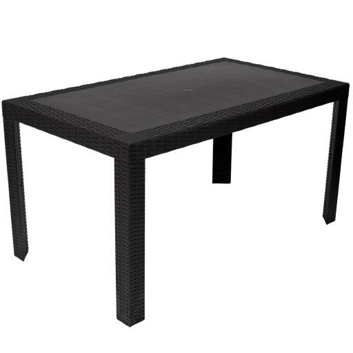 Blat stołu wykonany jest z odlewu polipropylenu w stylistyce technorattanu . Po środku blatu znajduje się praktyczny i przydatny otwór na parasol ogrodowy.