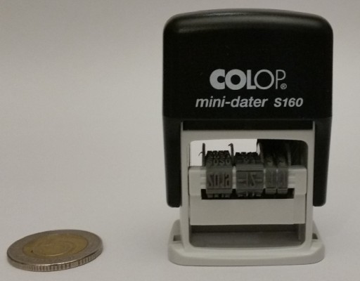 - automatyczny mały datownik samotuszujący COLOP S160 (1 sztuka, obudowa czarna) - z możliwością umieszczenia dowolnego niewielkiego dodatkowego tekstu - (pieczątki z samą datą znajdziesz na innych naszych aukcjach)