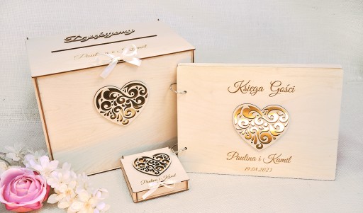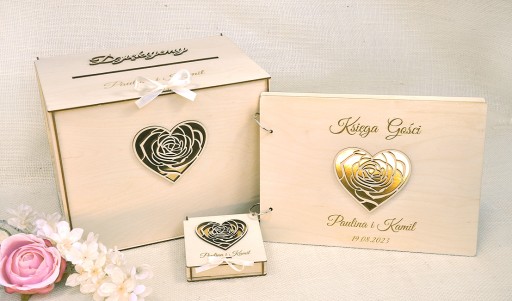 Elegancki zestaw - pudełko na koperty, księga gości i pudełko na obrączki - z personalizcją