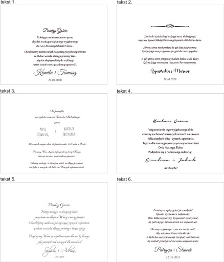 Na pierwszą stronę księgi gości proponujemy do wyboru 6 rodzajów tekstów: