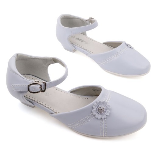 Buty komunijne dziewczęce na niskim obcasie z zaokrąglonym noskiem. Model z zakrytymi palcami i zabudowaną piętą. Zapinane na paseczek zakończony sprzączką. Wykonane z ekoskóry. Udekorowane z boku kwiatuszkiem z małymi cyrkoniami. Odcień bucików wpada w niebieski. Idealne buty na wielkie wyjścia .