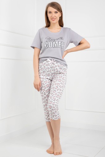 Modna, damska piżama Comfy, o sportowym, swobodnym charakterze. Nadruk w panterkę nadaje jej charakteru, który z pewnością przypadnie do gustu kobiecie pełnej energii. Model wykonany jest z bawełny przez co poczujesz się w piżamie bardzo komfortowo.