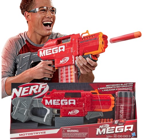 Wyrzutnia Motostryke z całą pewnością zrobi niesamowite wrażenie na niejednym przeciwniku. Półautomatyczna wyrzutnia posiada częściowo przezroczysty magazynek typu clip system, który mieści do 10 strzałek typu Mega. Na górze wyrzutni znajduje się szyna taktyczna, do której możemy podczepić celownik, bądź lunetę. Motostryke posiada także dwa punkty mocowania pasa, które znajdują się na górze z przodu i tyłu wyrzutni. Pomimo swoich dość dużych rozmiarów wyrzutnia jest wygodna w użytkowaniu, między innymi dzięki sporej szarej kolbie, która pomaga utrzymać stabilnie wyrzutnię podczas strzelania. Stań do walki i zdominuj pole bitwy wraz z nową wyrzutnią Nerf Mega Motostryke.