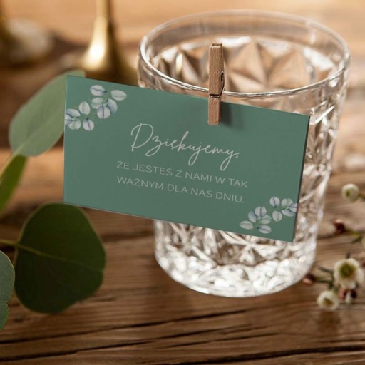 - skład: 10szt dwustronnych bilecików z podziękowaniem na Komunię dekorowanych z jednej strony napisem: Dziękujemy, że jesteś dziś z nami na eukaliptusowym tle oraz dekorowanych nadrukiem gałązek eukaliptusa; z drugiej strony znajduje się motyw eukaliptusowego wianuszka oraz napis Pierwsza Komunia Święta