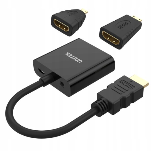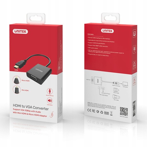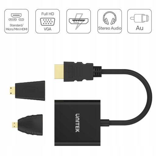 Standard VGA, w odróżnieniu od cyfrowego standardu HDMI, z zasady nie obsługuje dźwięku, dlatego w przejściówce HDMI marki Unitek zamontowano osobne wyjście audio przez port 3,5 mm Minijack, a do zestawu dołączone odpowiednio długi przewód audio. Adapter samodzielnie rozdziela sygnał, a do prawidłowej pracy potrzebuje czasem dodatkowego zasilania. Do tego celu służy popularny port microUSB, więc można podłączyć ładowarkę od telefonu.