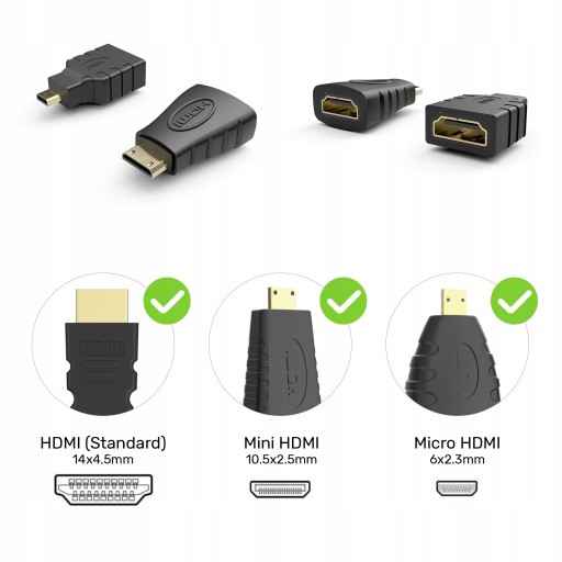 W zestawie znajdują się przejściówki z HDMI na microHDMI oraz z HDMI na miniHDMI, umożliwiające podpięcie do każdego rodzaju portu w tym standardzie. Adapter wspiera rozdzielczość FullHD 1080P z 10-bit DAC. Obsługiwane rozdzielczości: