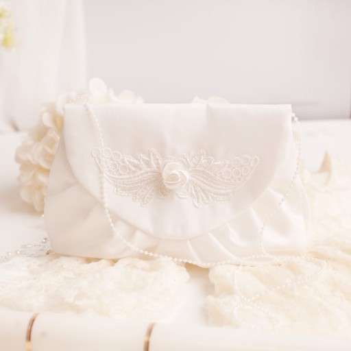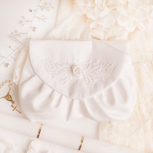 • Elegancka biała torebeczka udekorowana po środku kwiatem róży również w białej barwie oraz pięknym haftem z obu jej stron.