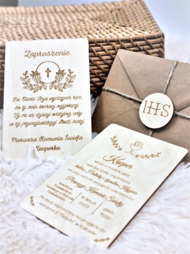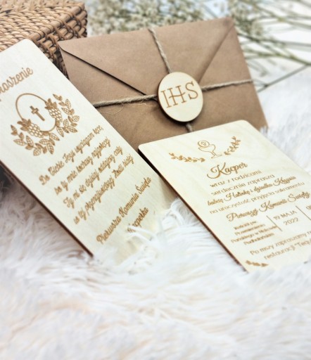 Drewniane Zaproszenia na komunię świętą Pełna Personalizacja.