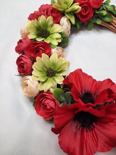 Prezentujemy śliczny wianek wiklinowy ozdobiony pięknymi sztucznymi kwiatami. Wianek został ozdobiony wysokiej jakości sztucznymi kwiatami w pięknych nasyconych kolorach. Ozdoba została wykonana ręcznie z najwyższą starannością.