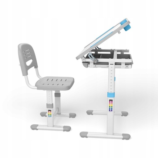 Ergonomiczne biurko z regulacją wysokości umożliwiającą dostosowanie do wzrostu dziecka. Zarówno na krzesełku jak i biurku znajdują się naklejki z zaleceniami ułatwiającymi regulację wysokości w zależności od wzrostu dziecka.