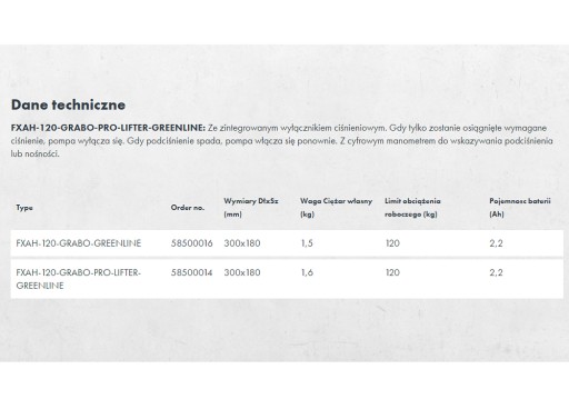 FXAH-120-GRABO-GREENLINE: Podciśnieniowy chwytak ręczny, ładowarka (napięcie wielozakresowe 110 V do 240 V) 1 x akumulator litowo-jonowy, zapasowa uszczelka gumowa i zapasowy filtr. Dostarczany w lekkim, miękkim etui.